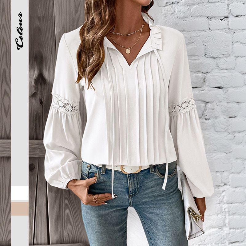 2025 New Spring Autumn European And American Elegant Temperament Top Cross-Border Lace V-Neck Solid Color Pleated