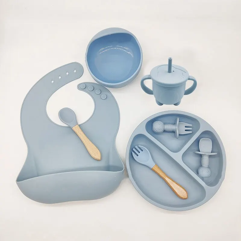 8PCS Kids Feeding Tableware Set Learn to Eat Training Fork Spoon Baby Dinner Plate Bib Complementary Food Suction Cup Bowl Set