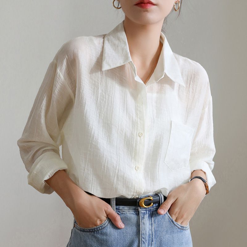 A Real Photo Of A White Tencel Shirt For Women, A Long-Sleeved Sun-Protective Shirt With A Gentle Design Sense For Sprin