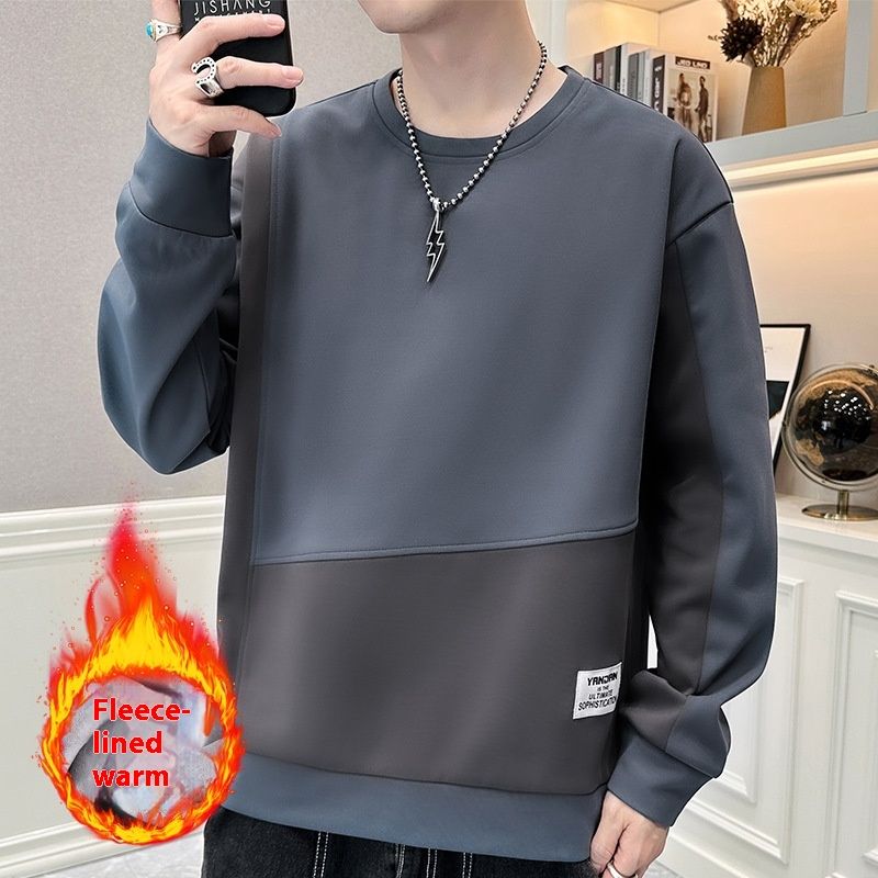 American style composite splicing hoodie for men's 2024 autumn and winter new item with thick velvet and loose casual round neck men's top