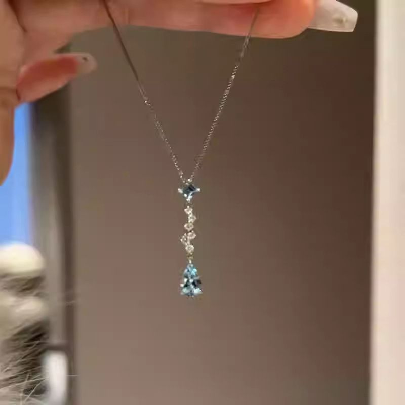 Aquamarine Zircon Square Water Drop Pendant Necklace Fashion Simple Versatile Elegant Collarbone Chain Light Luxury