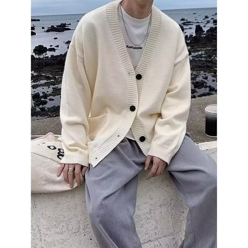 Autumn Winter Cardigan Knitted Sweater Men's Jacket Deep V-Neck Solid Color Loose Lazy Style