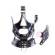 The BDSM mask includes metallic rings around the eyes and the mouth. The eyes can be covered by the attached blindfold, while the mouth can be stuffed with a silicone gag. Use any combination of the gag and blindfold to give your parer the proper discipline.