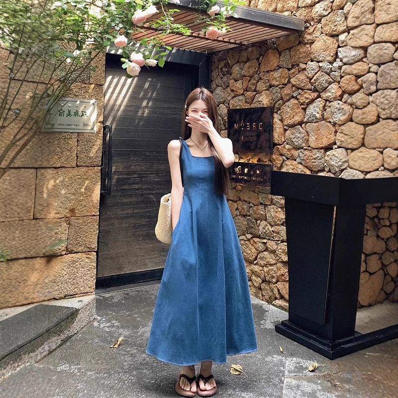 Blue sleeveless denim camisole dress for women's spring and summer new style square collar waist slimming French style long skirt