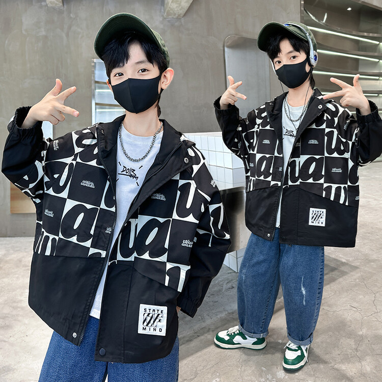 Boys' large plaid jacket 2023 Spring and Autumn new handsome hooded windbreaker, big children's explosive