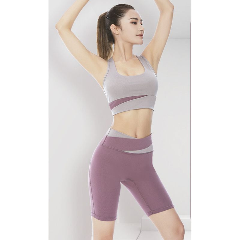 Color Block High Tummy Control Peach Butt Crop Top Yoga Shorts Set Shockproof Gather Waist Slimming Leg Fitness Bra