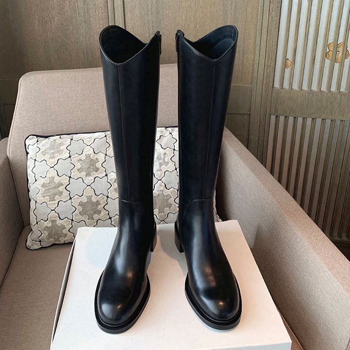 Cowhide Version~2025 New V-Neck Thick Sole Fleece-Lined Chunky Heel Mid-Calf Riding For Women Autumn Winter Genuine