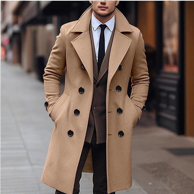 Cross-border Autumn And Winter Men's Solid Color Medium And Long Woolen Coat Korean Version Double-breasted Tweed Trench Coat