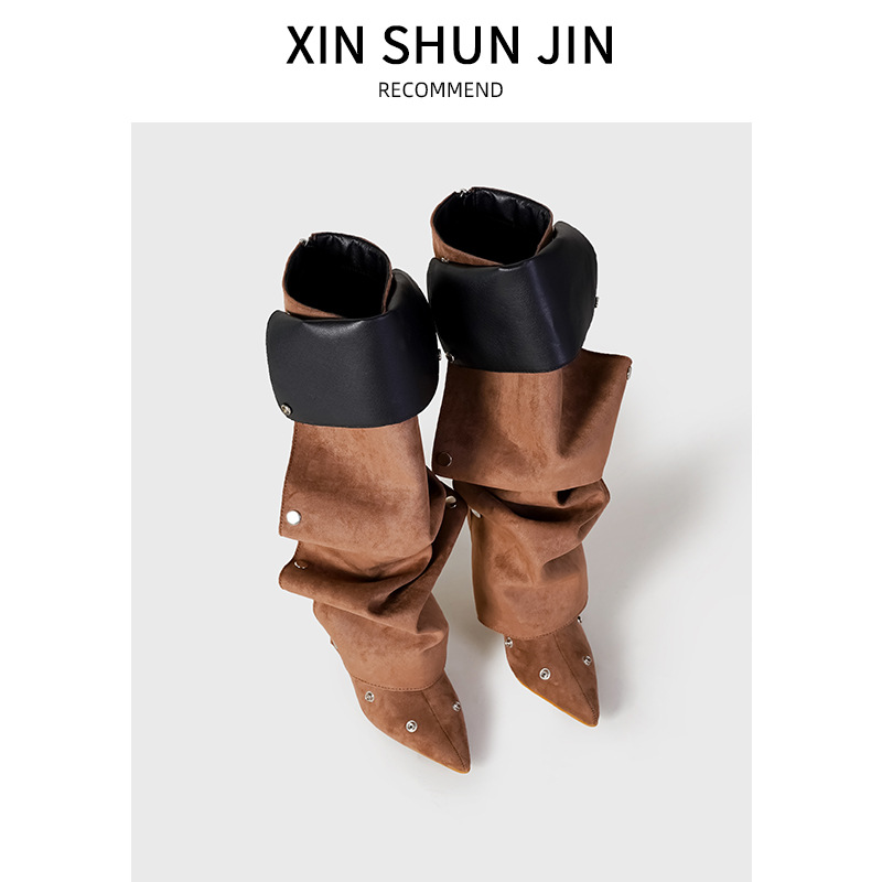 Women's Shoes rivet buckle splicing two way wear stiletto denim pleated pile boots female personality hot girl fashion long boots female
