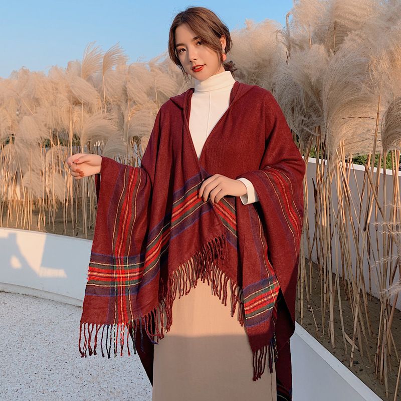 Ethnic style shawl Women's cape with hat Thickened warm Xizang travel scarf with hat cloak coat