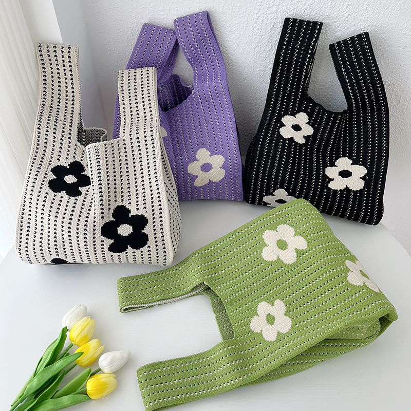 Small Flower Handbag for Women, Knitted Storage Bag, Large Capacity Small Bag, Student Casual Bucket Wrist Bag, Lunch Box Bag