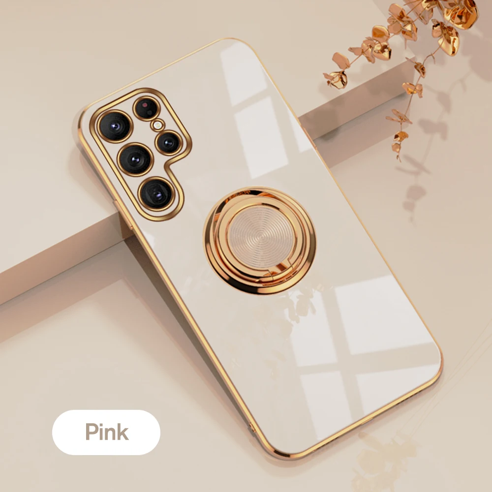 For Samsung Galaxy S24 Ultra Case Gold Frame Plating Soft Cover SamsungS24 Plus S24+ S24Ultra 5G Car Magnetic Ring Holder Fundas
