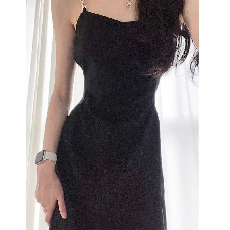 French style design black hip hugging mid length 2025 summer new slim fit and slimming waist cinching suspender dress