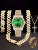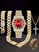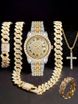 Hip Hop Diamond-Studded Watch Five-Piece Set With Diamond-Shaped Chain Cross Necklace And Cuban Ring