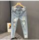 Thin and distressed elastic 2023 summer slim fit ruffled and handsome cropped jeans, men's fur edge trendy small leg casual pants
