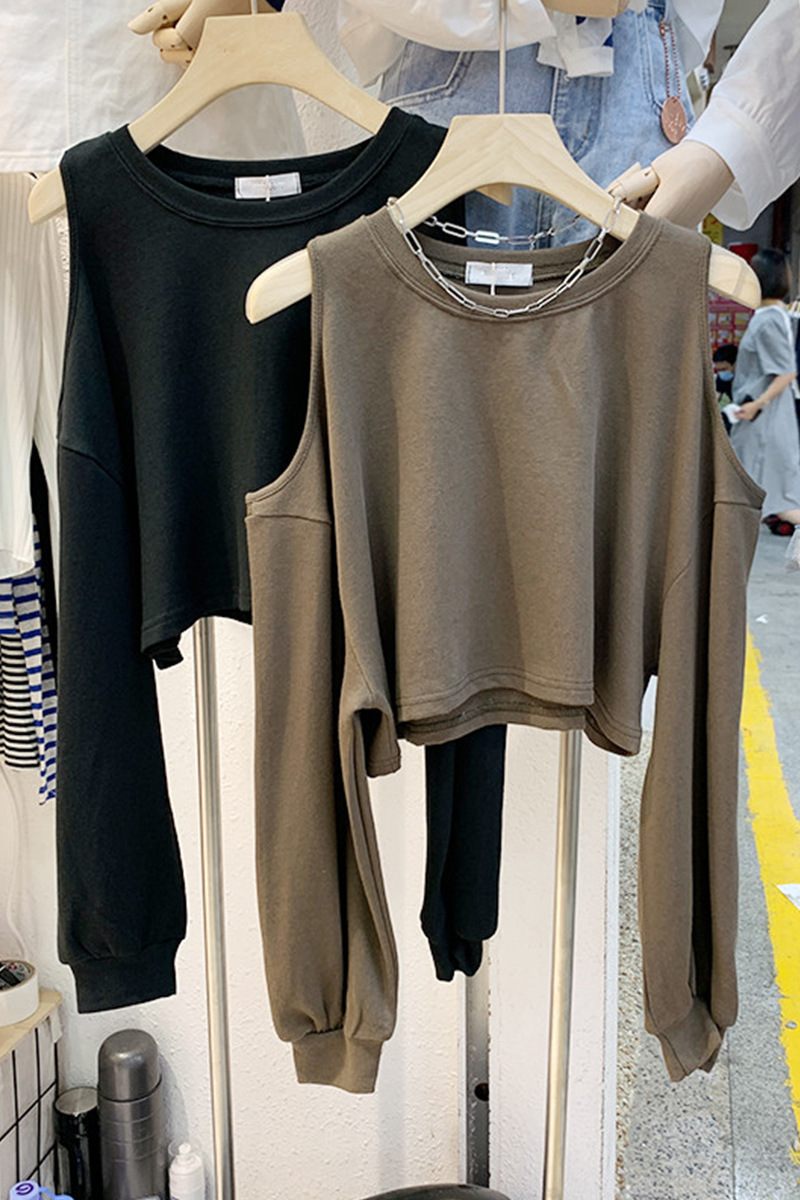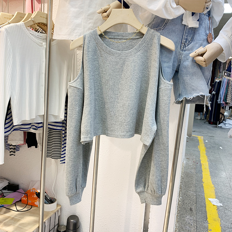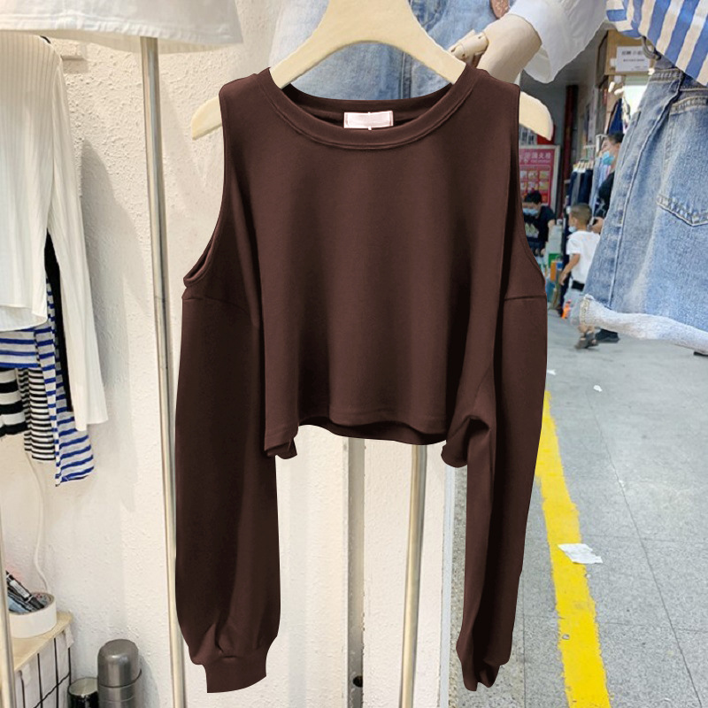 Off shoulder round neck long sleeved T-shirt autumn and winter loose solid color hollowed out casual bottom shirt for