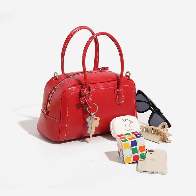 Oil Wax Leather Red Bride Wedding Boston With Lock Key Commuter Handbag Bowling Single Shoulder Crossbody Bag