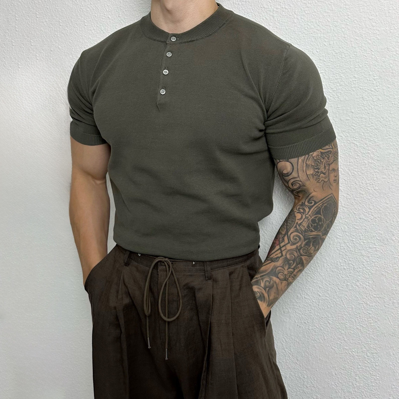 QFV507045555501<2 Henry Collar Short Sleeve Knitted Shirt For Men Summer Ice Silk Breathable Slim Fit Muscle-Showing Business European And