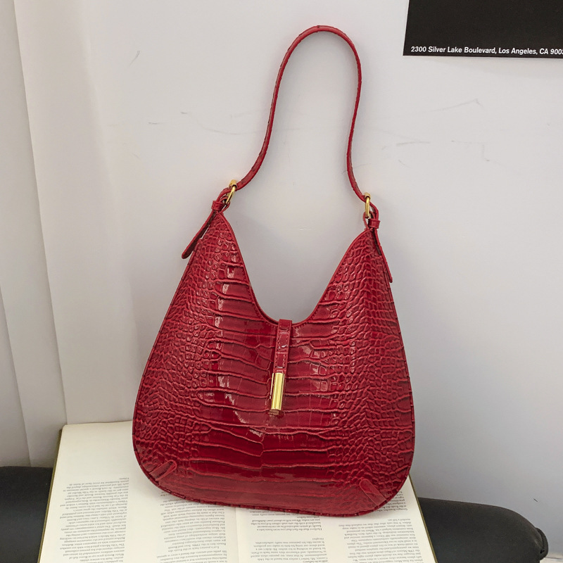 Saddle Bag With Alligator Embossed Texture – Unisex Shoulder Bag With Buckle Strap In Deep Red/Black/White (Structured PU, Minimalist Lock Closure)