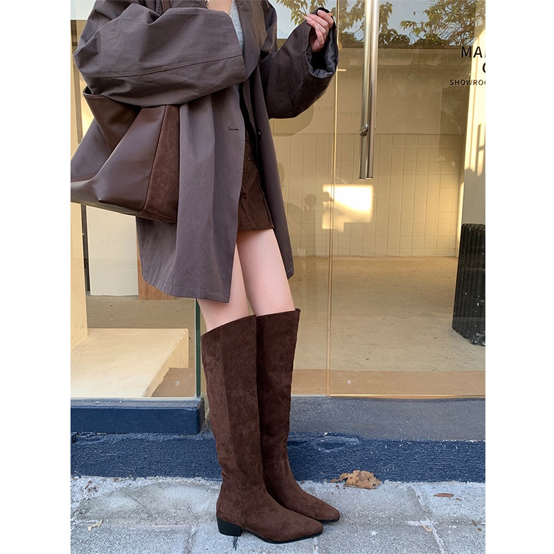 ShoeGlobe ShoeGlobe Pointed Toe Chunky Heel Pleated Slouch 2024 Autumn Winter New Veratile Mid-Heel Suede High Tube Long Boot Women'