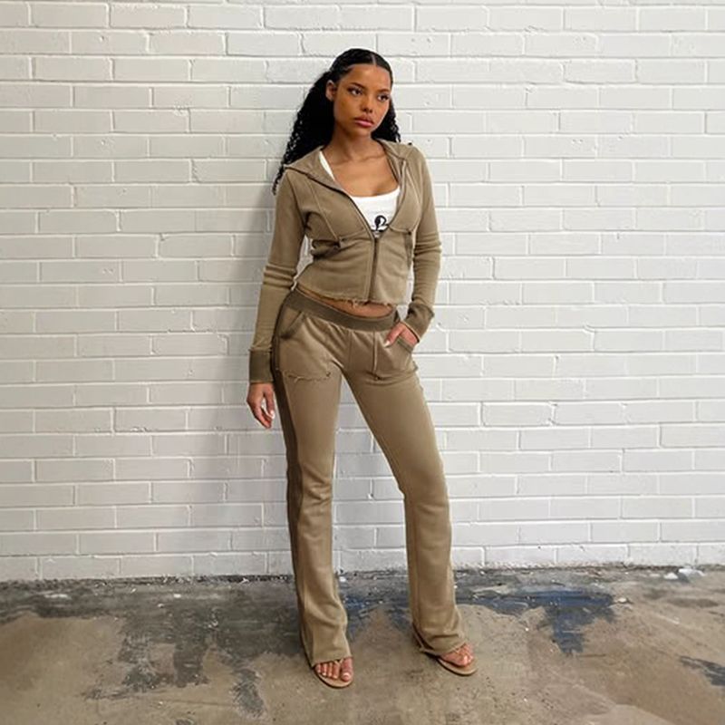 Sports Autumn Casual Sweatshirt Set Color Block Frayed Hooded Jacket Low Waist Flared Pants Street Style Women's