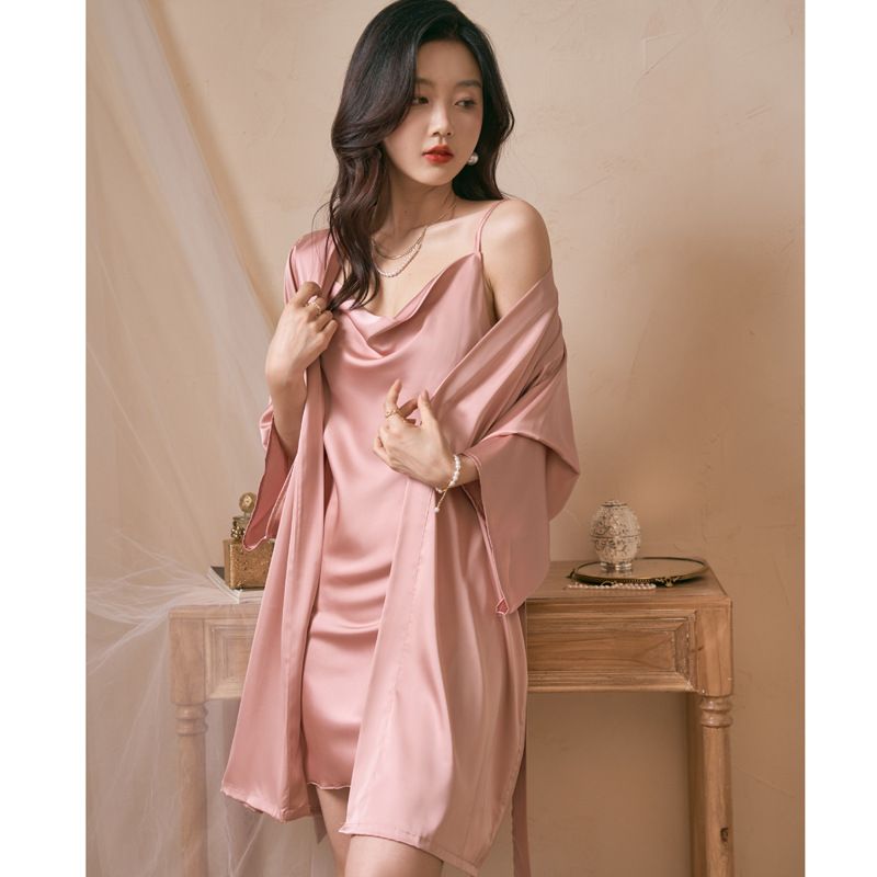 Spring and Summer Sexy Ice Silk Long-sleeved Nightgown Women's Two-piece Set Thin Pure Nightgown with Sling Nightgown High-end Nightgown