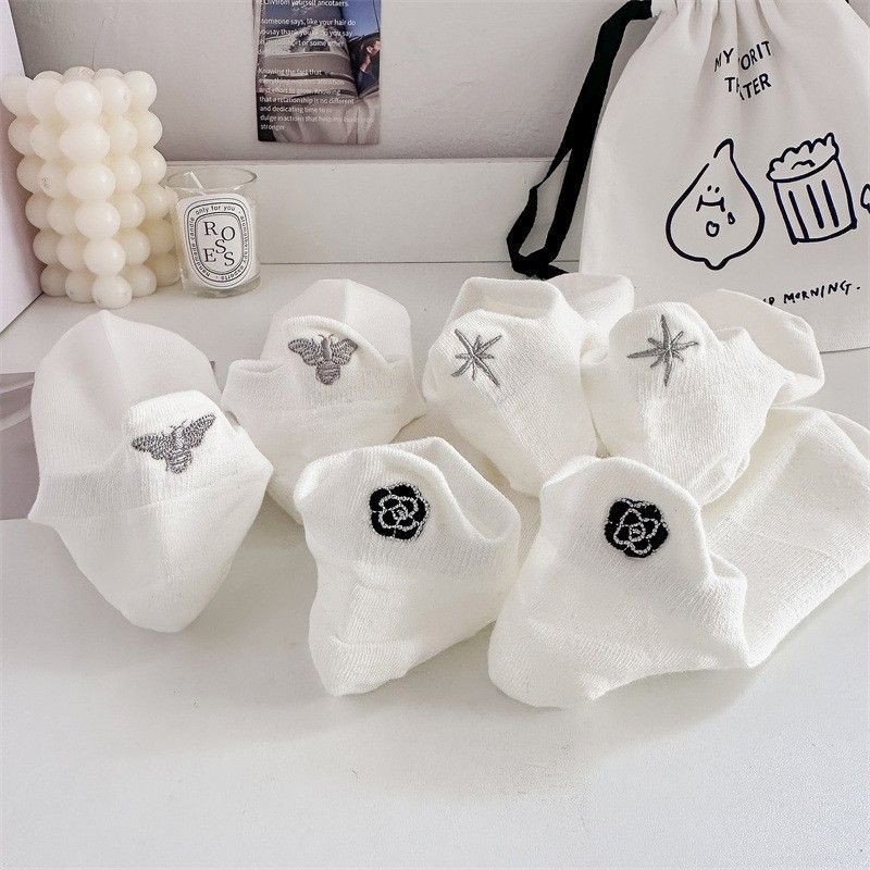 Socks children summer thin black and white women's boat socks ins trendy heel embroidery bee six pointed star mountain camellia invisible socks