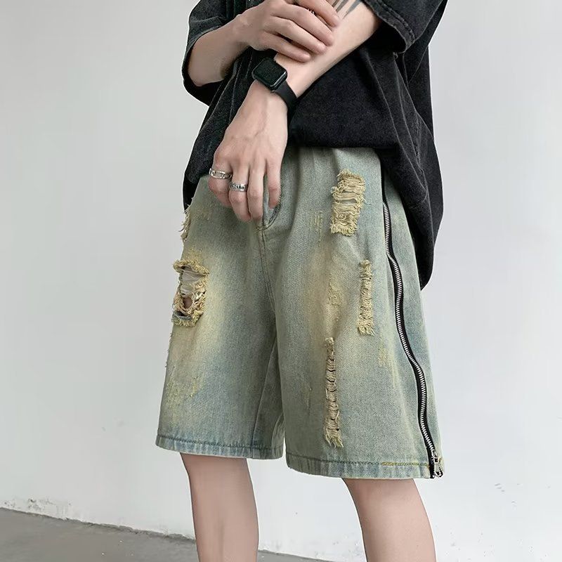 Summer tide brand trend handsome pants American retro loose jeans summer thin men's overalls shorts men.