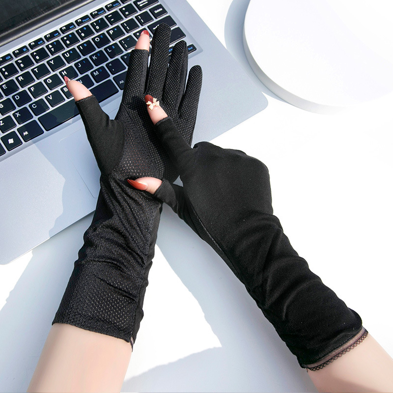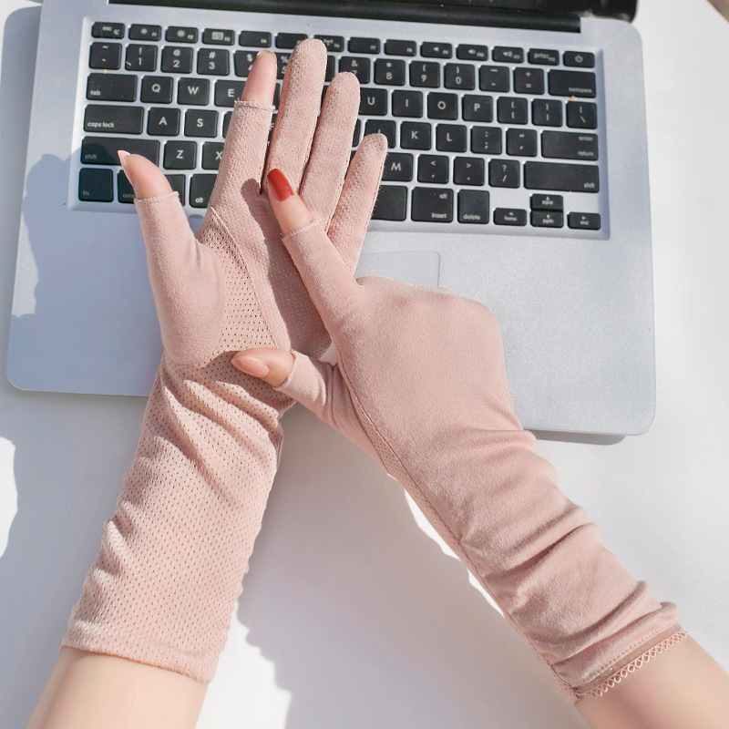Sunscreen Gloves Women's Mid-Length Summer Thin Driving Ride Tea Picking Nail Art Non-Slip Cotton Breathable Open Fingers Spring and Autumn Half Finge