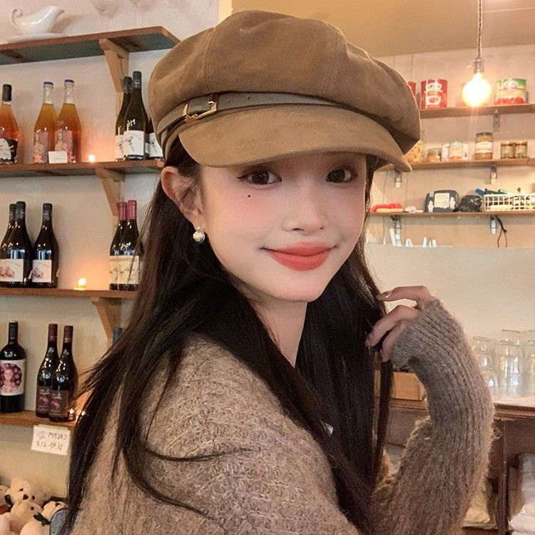 Vintage Suede Octagonal Hat for Women, Autumn and Winter British Style Buckle Beret Newsboy Painter Hat