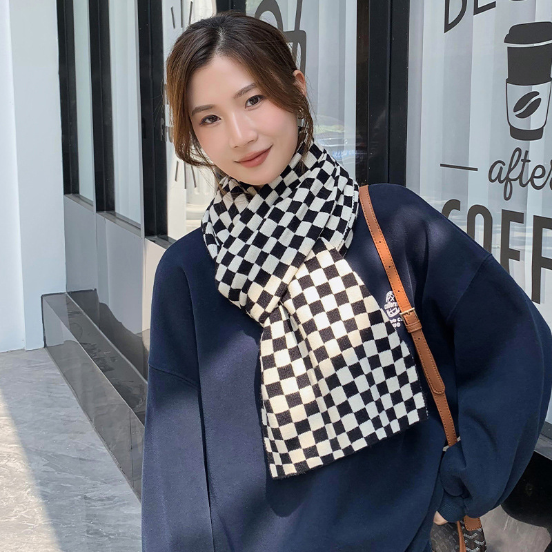 Xiaozhong Chessboard Checkered Knitted Woolen Scarf Women's Autumn and Winter Black and White Checkered Pattern Korean Version Versatile Student Spring and Autumn Scarf